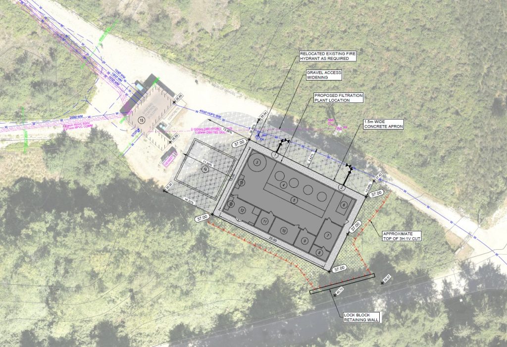 - The proposed water treatment at Lost Shoe Creek is an addition of a single storey building with a footprint of 25m x 15m with an internal height of 4.5m with a below grade residuals tank.