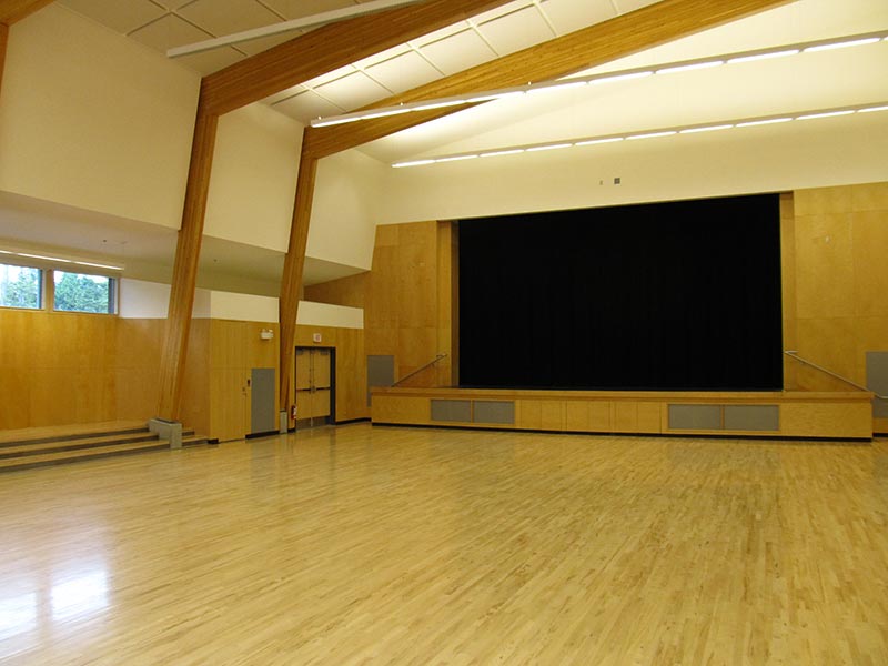 - Large performance stage with full theatre draperies